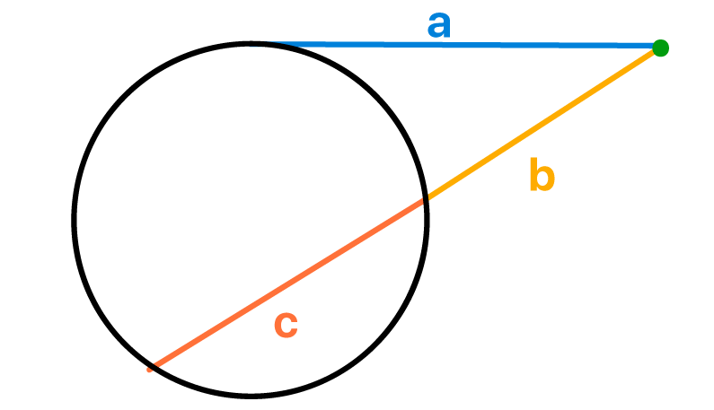 A única medida que a reta tangente possui é a, enquanto que a medida completa da reta secante pode ser dada pela soma entre os comprimentos b, e c. Assim, se preparem para conhecer mais uma fórmula!