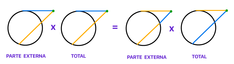 Viram que interessante? Se nós tivermos em mente a frase “parte externa vezes total”, conseguiremos relacionar as medidas das duas retas secantes e da reta secante e da reta tangente que se interceptam em um único ponto externo a circunferência! É por isso que na fórmula do último caso, temos o termo a²: quando se fala em reta tangente, a medida da parte externa é igual a medida total!