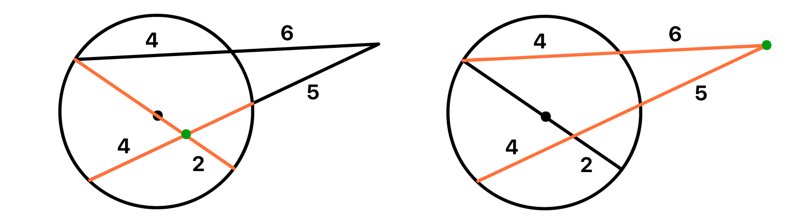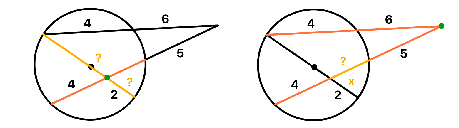 Se nós tentarmos resolver a questão levando em conta as medidas das cordas que se interceptam em um ponto interno a circunferência, reparem, nos faltarão duas medidas importantes. Contudo, se partirmos do ponto de vista das retas secantes, teremos mais sucesso, afinal, nos faltará apenas a medida de uma parte do segmento interno de uma das retas secantes em relação a circunferência.
