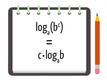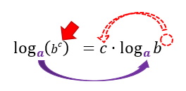 Notem que esta propriedade é bastante diferente das anteriores, e por isso o seu conceito pode soar um pouco confuso. Mas fiquem tranquilos, a ideia é bem simples: quando o logaritmando de um logaritmo qualquer for composto por uma potência de base b e expoente c, é possível passar o expoente c dessa potência para frente do logaritmo, e então, c passará a multiplicar o logaritmo de b. É só pensar que o expoente da potência deve pular lá pra frente do logaritmo e multiplica-lo como um todo! E ainda temos a seguinte vantagem: a base a do logaritmo não sofre alteração alguma, como mostra a figura abaixo: