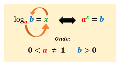 No quadro acima, é possível ver todos os termos que compõem um logaritmo: a é conhecido como sua base, enquanto o termos b e x são chamados, respectivamente, de logaritmando e logaritmo ou resultado da operação. O quadro também nos mostra que a logaritmação é a operação inversa da exponenciação, e isso justifica as restrições que os valores de a e b possuem. A base a deve ser sempre um valor maior que zero e diferente de 1, enquanto que o logaritmando b deve ser necessariamente um valor maior que zero, ou positivo.