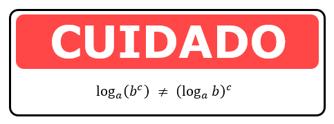 E lá vem esse quadro enorme novamente! É que quando se fala em potenciação, também é bem importante o uso dos parênteses nas expressões. Vejam que no primeiro logaritmo apresentado, o expoente c pertence apenas a base b da potência, e portanto apenas ao logaritmando. Quando isso acontece é possível utilizar a propriedade que acabamos de estudar. Contudo, no segundo logaritmo apresentado, c é o expoente do logaritmo como um todo, fato que nos impede de aplicar a propriedade. As duas expressões não resultam no mesmo valor.