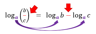 Da mesma forma que na propriedade anterior, as restrições para os valores da base a (a > 0 e a ≠ 1) e para os valores dos logaritmandos b e c (b > 0 e c > 0) permanecem valendo. E o mais interessante dessa propriedade, é que podemos utilizar a semelhança entre o sinal de divisão e o sinal de subtração para memorizar que uma divisão em um mesmo logaritmo gera uma subtração de dois logaritmos distintos. É claro que realizar o processo inverso da propriedade também é válido, mas transformar uma subtração em um mesmo logaritmo em uma divisão de dois logaritmos distintos é completamente incorreto!