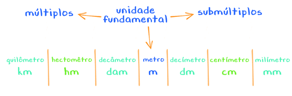 Se vocês olharem novamente a imagem, a direita do metro, encontrarão também três submúltiplos. O primeiro submúltiplo é o decímetro, representado pelo dm, o próximo submúltiplo é o centímetro, representado pelo cm, e a última unidade de submúltiplos em relação ao metro é o milímetro, representado por mm.