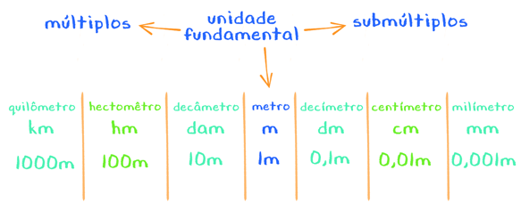 O sistema métrico decimal é totalmente embasado em uma unidade fundamental. No Brasil essa unidade fundamental é o metro, que é representado pela letra m minúscula. A partir do metro, existem outras unidades a sua direita, como também outras unidades a sua esquerda. As unidades a esquerda são classificadas como múltiplos do metro. Já as unidades que se encontram a direita são classificadas como submúltiplos do metro. Nós vamos ver quais são os múltiplos e os submúltiplos em relação ao metro na sequência.