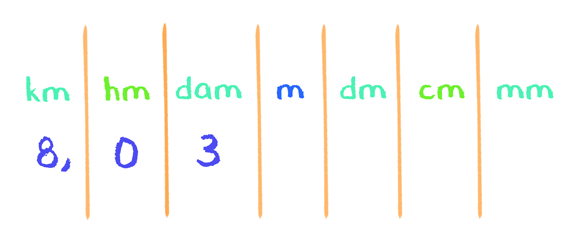Vamos fazer mais um exemplo, agora 8,03 km. Vamos ver como seria a leitura desse número em relação ao quadro de unidades. Colocamos a parte inteira, que é o 8, na coluna dos quilômetros, e a vírgula junto ao 8. Já os dois algarismos da parte decimal, o 0 e 3, nós colocamos um em cada coluna a direita do 8.