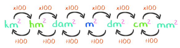 Se a gente quiser transformar de quilômetro quadrado para decâmetro quadrado, haverá dois saltos para a direita, ou seja, haverá duas vezes a multiplicação por 100. Dessa forma faremos a multiplicação por 100², que será de 10 000. E assim funciona para todos os saltos de unidades que estão mais à esquerda, para as que estão mais a direita.