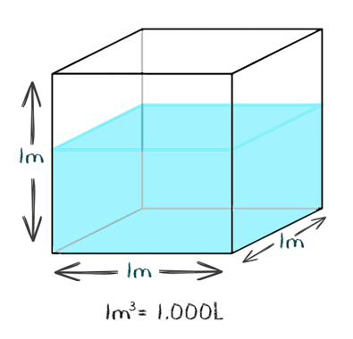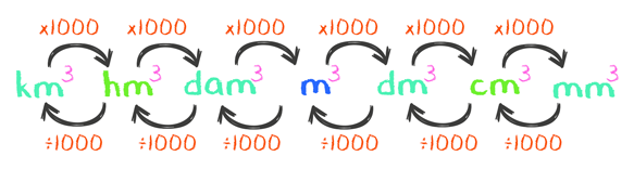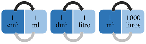 As unidades de volume seguem a mesma regra em relação a área. Na área, as unidades estão ao quadrado, enquanto no volume as unidades estão colocadas ao cubo, pois temos três dimensões, comprimento, largura e altura. Imagino que vocês repararam nisso no quadro acima.