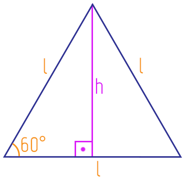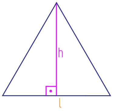 A partir dessas características, nós podemos definir facilmente duas fórmulas importantes: a da altura e a da área de um triângulo equilátero com relação a medida do seu lado l. Começaremos pela altura, lembrando que ela deve ser sempre a medida do segmento que sai de um dos vértices do triângulo, e forma 90º com o lado oposto ao vértice escolhido, nesse caso, com a base do triângulo, como mostra a figura:
