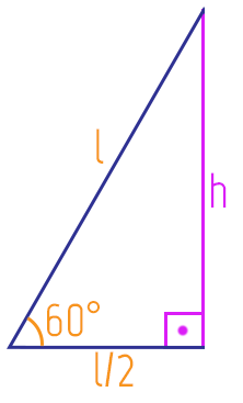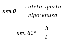 Nós estudamos no texto Relações Métricas no Triângulo Retângulo, que o maior lado de um triângulo retângulo é sempre a sua hipotenusa. Ainda, aprendemos que os demais lados, ou aqueles que formam um ângulo de 90º entre si, são os catetos do triângulo. Vejam então que o cateto h, é o cateto oposto ao ângulo de 60º que podemos ver na imagem. Assim, conhecendo as relações trigonométricas que podem ser aplicadas ao triângulo retângulo, no caso, o seno, o cosseno e a tangente, nós sabemos que aquela que está diretamente ligada ao cateto oposto h e a hipotenusa, que é o lado l do triângulo, é certamente o seno. Esse é o ponto de partida para definirmos a fórmula da altura do triângulo equilátero. Vejam só:
