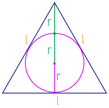 Acontece que, incrivelmente, se nós traçarmos o segmento que representa a altura do triângulo equilátero, veremos que o apótema r cabe 3 vezes nesse segmento, ou seja, a altura desse tipo de triângulo é sempre igual ao triplo de seu apótema, olhem só:
