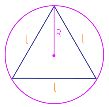 No caso em que a circunferência é circunscrita ao triângulo equilátero, ou seja, quando ela se encontra por fora desse triângulo, o seu raio não terá uma denominação específica, e será representado por R, porque claro, sempre será maior do que o apótema do triângulo equilátero. Vejam só como representa-lo: