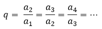 Como foi dito agora a pouco, os termos de uma PG estão relacionados por uma razão, que chamamos de q. Essa razão pode ser obtida, quando dividimos um termo sucessor pelo seu antecessor, em qualquer ponto da sequência. Assim podemos dizer que: