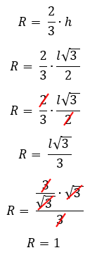 Aí novamente, se traçarmos o segmento que representa a altura do triângulo equilátero, e dividirmos o mesmo em três partes, veremos que o raio R da circunferência circunscrita ocupa duas dessas três partes que formam a altura, ou seja 2/3 da altura. Assim, podemos obter uma nova conclusão, olhem só!