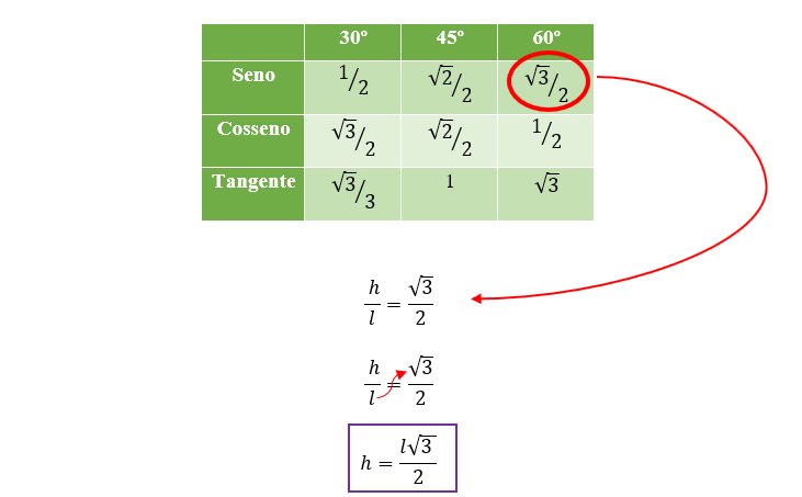 Bom, uma vez que conheçamos o valor do seno de 60º, poderemos obter uma relação entre a medida do lado do triângulo equilátero e a sua altura. Por isso vou deixar aqui a conhecida tabela dos ângulos notáveis, e a partir do valor apresentado nessa tabela, poderemos continuar nossa dedução.