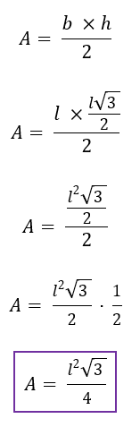 Comparando o triângulo que vemos na imagem acima, com o triângulo equilátero que estamos analisando, podemos perceber que o valor da base, no nosso caso, é l. Já com relação ao valor da altura, devemos lembrar que acabamos de deduzi-lo também em função de l. Substituindo todos os valores na fórmula, nós chegaremos a uma conclusão interessante, acompanhem!